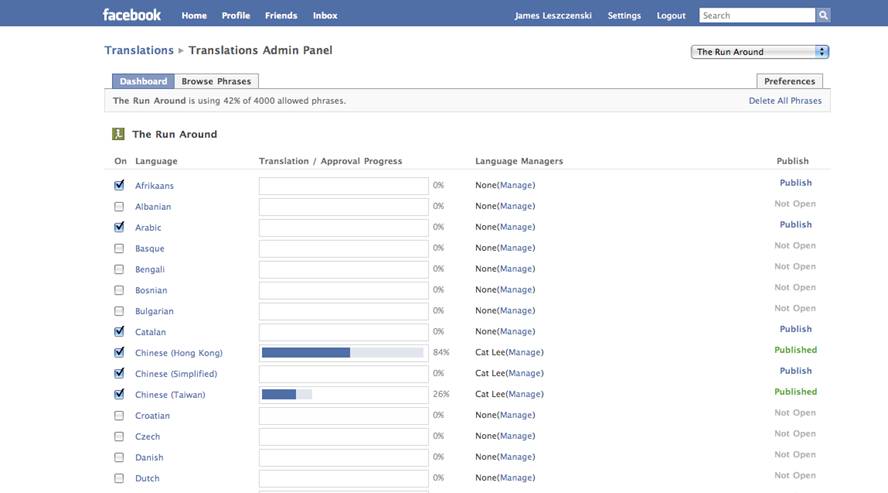 - 言語マネージャーを指定する:Language Managersカラムで、どのFacebookユーザが翻訳を監督できるか指定できます。アプリケーションが全翻訳者に公開されているかに関わらず、これらのユーザは翻訳を閲覧/追加/削除することができます。
