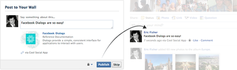 アプリケーションとユーザとの関係は、アプリケーション内部だけでなく外部でも構築されます。たとえば、Facebookプロフィールに投稿するのは、アプリケーション内での動作を共有し、友だちを誘い込む良い方法です。ユーザに対して投稿を制御させる事や、友だちに取って興味深く意味のあるコンテンツを提供する事を強くお勧めします。また、適切なコンテンツを適切なタイミングで投稿する事でユーザの期待を裏切らない事も大事です。