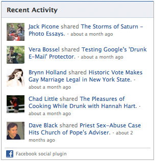 すでに多くのウェブサイトが social pluginsを用いてサイト上でのユーザアクションを表示しています。Sporting Newsにとってこれは、友だち間でもっとも人気のある記事を表示するいい方法です。Rdioにとっては、新しい音楽を発見する方法となっています。