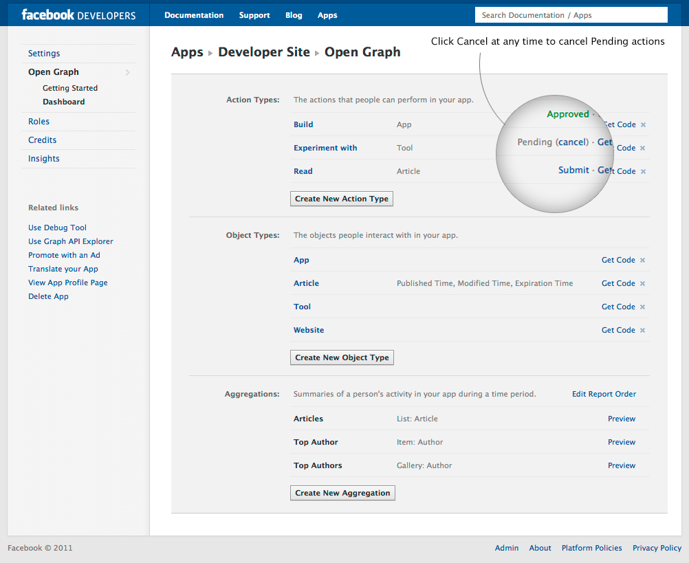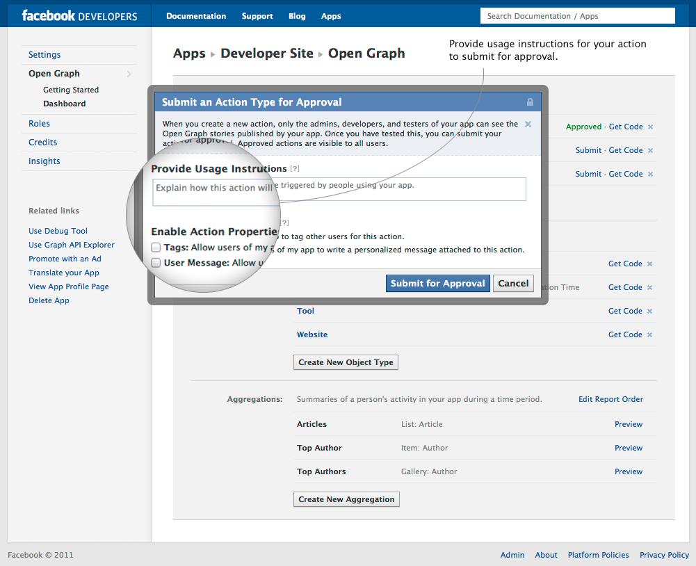 Facebook Platformを使うことによって、7億5000万を越えるユーザに対して、コストや摩擦無しでリーチすることが可能となります。Open Graphにより、APIを叩くだけで全Facebook体験に関わることができるようになりますので、まずはOpen Graph actionを公開するまでに必要となるレビューと承認のプロセスについて解説します。このプロセスは明解です。まず、アプリケーションでOpen Graphを使い始めると、全Open Graphアクティビティが開発者とテスターに見えるようになります。これにより、自分のアプリケーションを端から端までテストできます。それが完了したら、Dev Appを通じてアクションを申請してレビューしてください。あなたのOpen Graph利用が基準を満たしていると確認できたら、全Facebookユーザに対してOpen Grpaphアクションを公開できるように承認します。アプリケーションを承認しているのではなく、Open Graphの利用法を承認しているだけである点に気をつけてください。