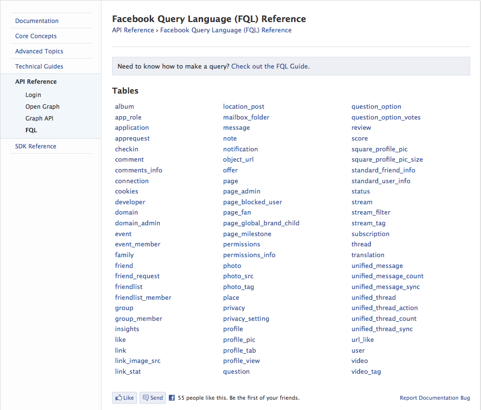 去年12月以来、FQLのドキュメントはFacebook Platformのソースコードから生成されるようになりました。これにより、従来よりも正確でなおかつ最新の状態が保たれると発表されていますが、それでもドキュメントだけを頼りに開発を進めるのは辛いものです。