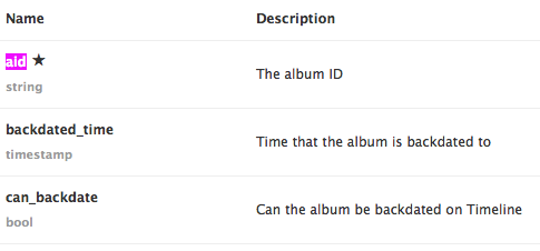 userテーブルにはuid(user id)というカラムが存在します。これはOpen Graph IDなので、先述の通りOpen Graph上で固有のものです。https://graph.facebook.com/UID でユーザ情報を得ることができます。また、albumやphotoテーブルには、aid(album id)やpid(photo id)といったカラムが存在します。user.uidの流れで、これらもOpen Graph IDであるように見えます。事実、user.uidの説明は"The user ID"、album.aidの説明は"The album ID"と書かれているだけなので、扱いが違うようには見えません。