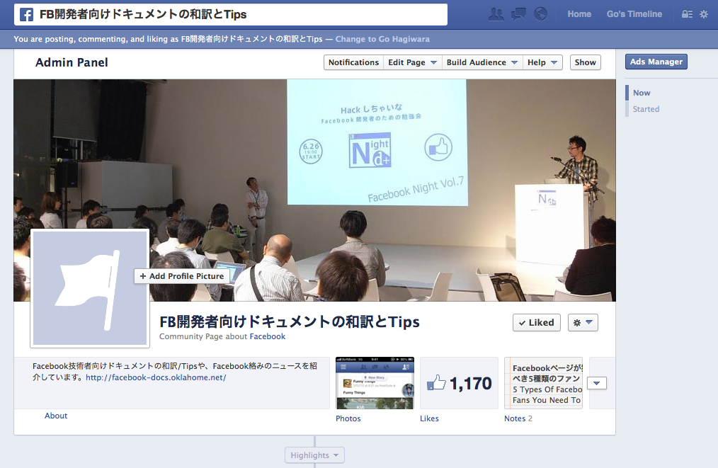 こんばんは。「FB開発者向けドキュメントの和訳とTips」管理人のOklahomerです。こんな書き出し方できるのも、Facebookページ名を「Oklahomer」から「FB開発者向けドキュメントの和訳とTips」に変えてもらったおかげです。